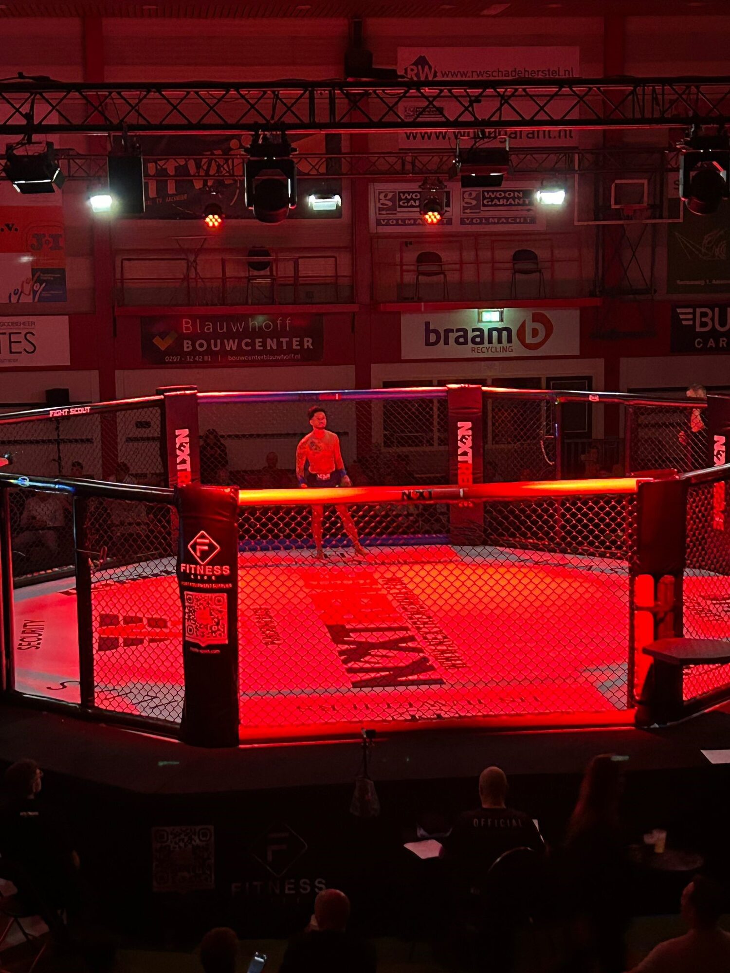 In onze eigen ruimte kleedde ik me om. Vechtshort gesponsord door Jari Woning & Projectstoffering, shirt van mijn gym ZeroFifty Fights & Sports. Handen ingetapet, schaduwboksen, stretchen, padsen.