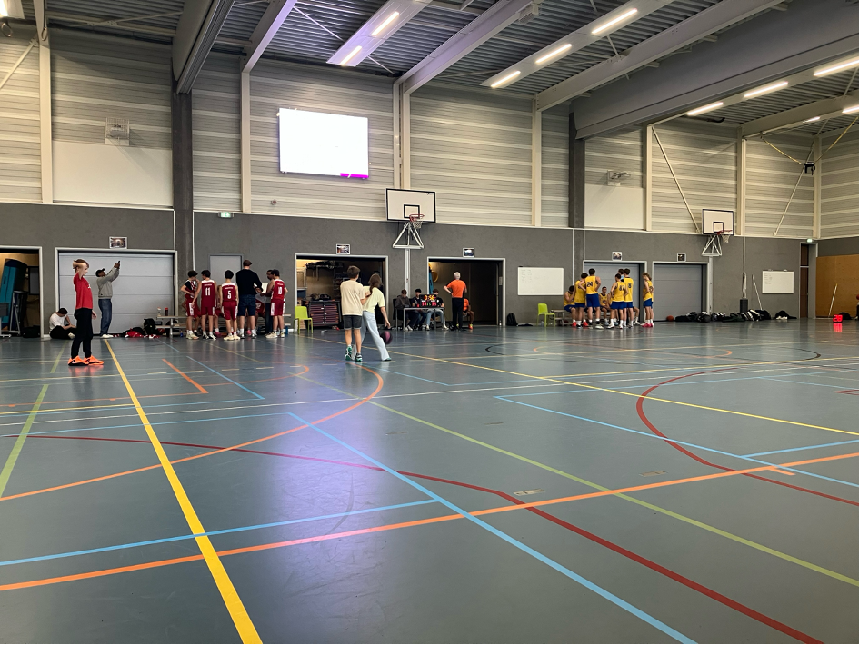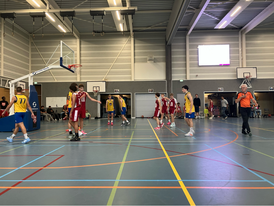 Het was al aardig druk in de zaal, maar gelukkig had ik een mooi plekje gevonden. Ik zat naast de moeder van Tycho en dat was heel fijn, want ze kon mij mooi wat spelregels uitleggen over basketbal, waarvoor dank! Ik ben, zoals jullie vast wel weten betrokken bij een voetbalteam, dit was voor mij de eerste keer dat ik bij een basketbalwedstrijd was. Een wedstrijd bestaat uit 4 kwarten van 10 minuten. Tussen elk kwart heb je 2 minuten pauze. Behalve tussen het 2e en 3e kwart, want dan heb je 15 minuten pauze. Verder is het zo dat elke keer als het spel stilligt, de tijd ook stil staat. Met andere woorden, de 10 minuten per kwart is zuivere speeltijd. Tot zover een wat uitleg over de sport basketbal, anders wordt dit stuk echt te lang en het gaat natuurlijk om de wedstrijd.